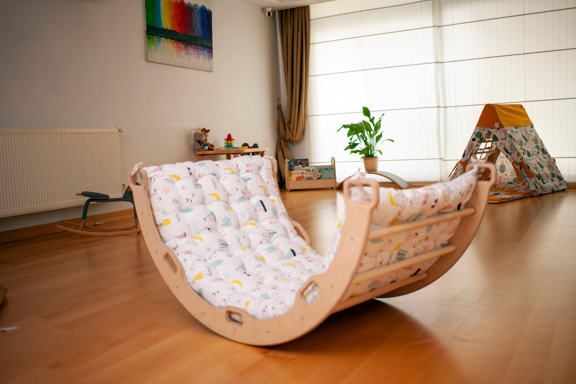 Climbing Arch/Rocker and Gray Space Design Pillow. Kids Montessori Rainbow Rocking Chair Board Multifunctional Waldorf Wooden Climbing Arch Rocker Board Play Set.