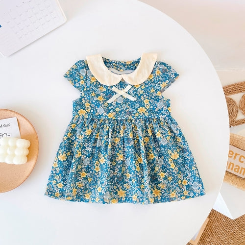 Baby Girls Floral Print Backless Design Doll-Neck Dress With Bow