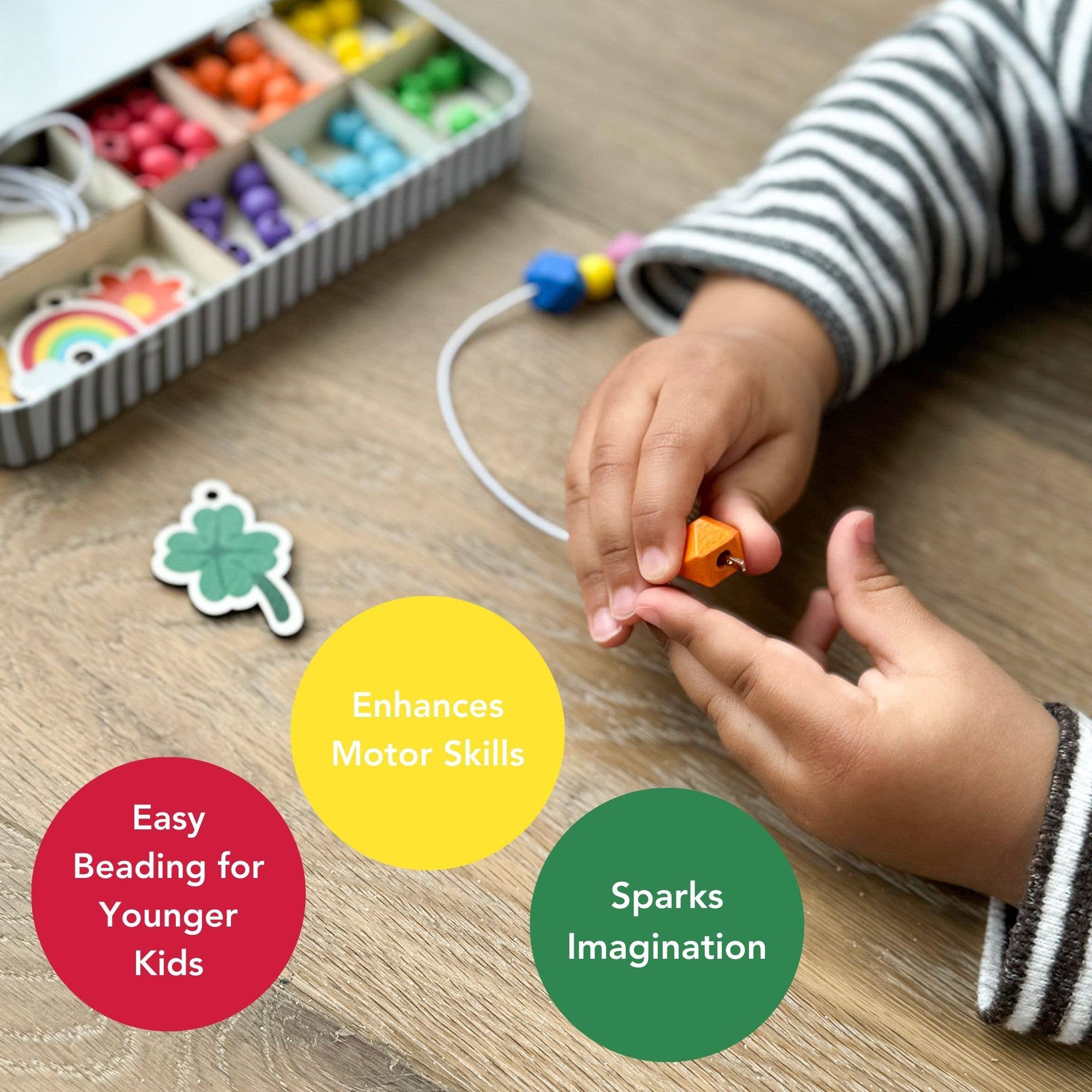 The Lucky Dip Keyring making kit is a wonderful plastic free activity. It offers a selection of wooden fobs to include a clover, flower, starfish, ice cream & a rainbow, allowing children to create 5 keyrings. The kit also comes with rainbow coloured spacer & geometric beads to complement the showpiece beads for vibrant accessories!