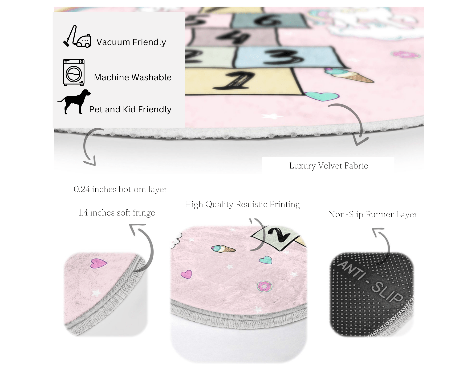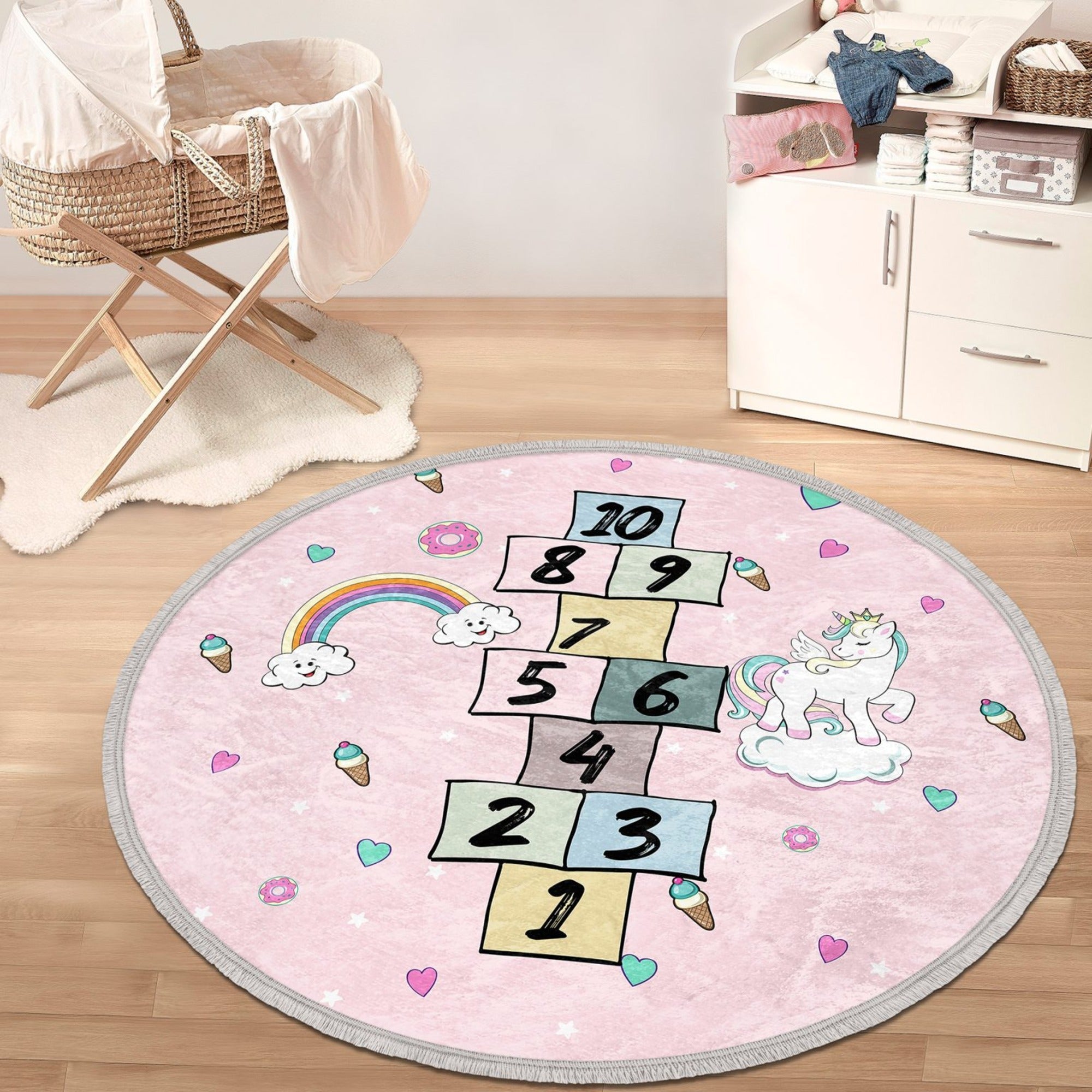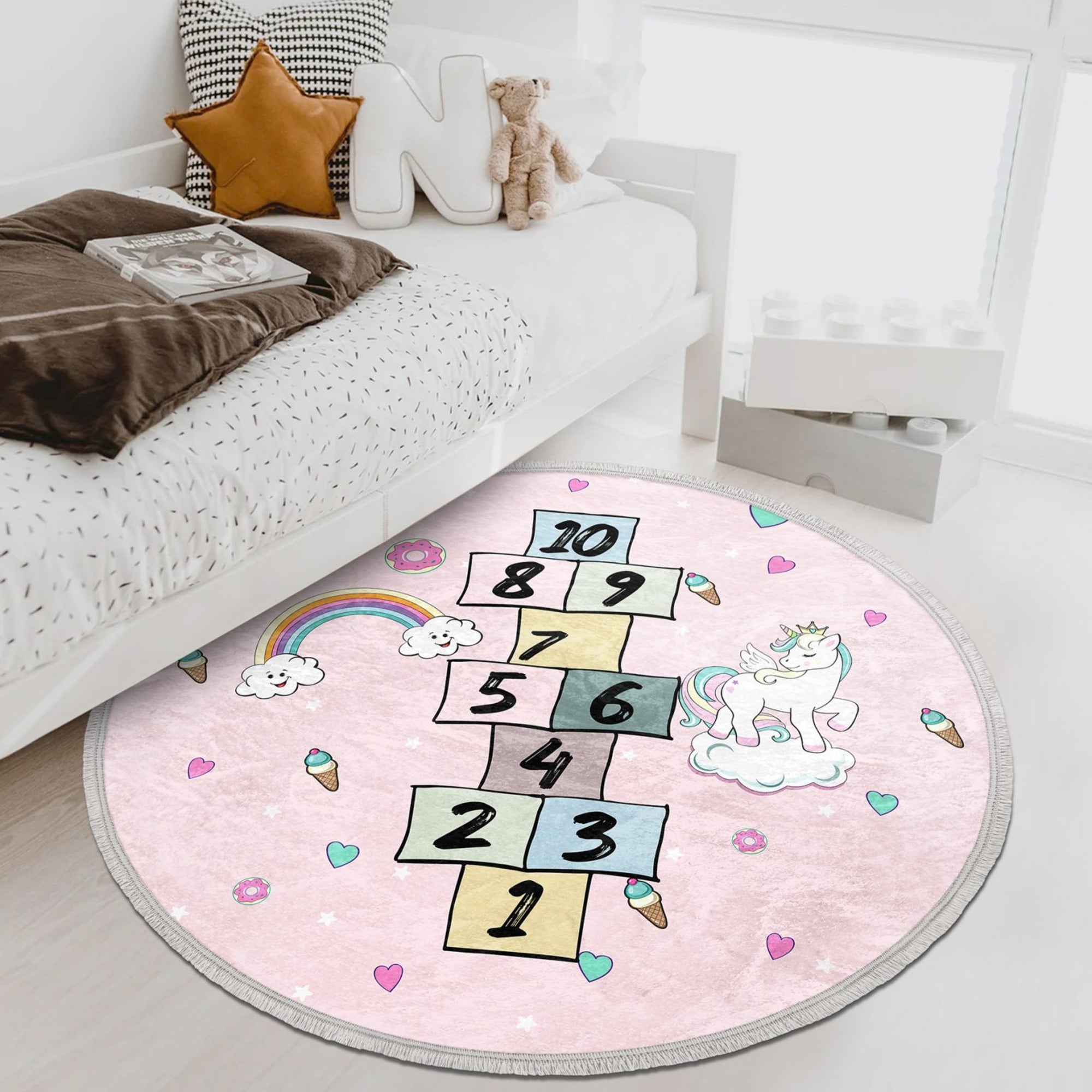 Pink Girls Room Area Rug With Unicorn, Numbers Printed Pink Nursery