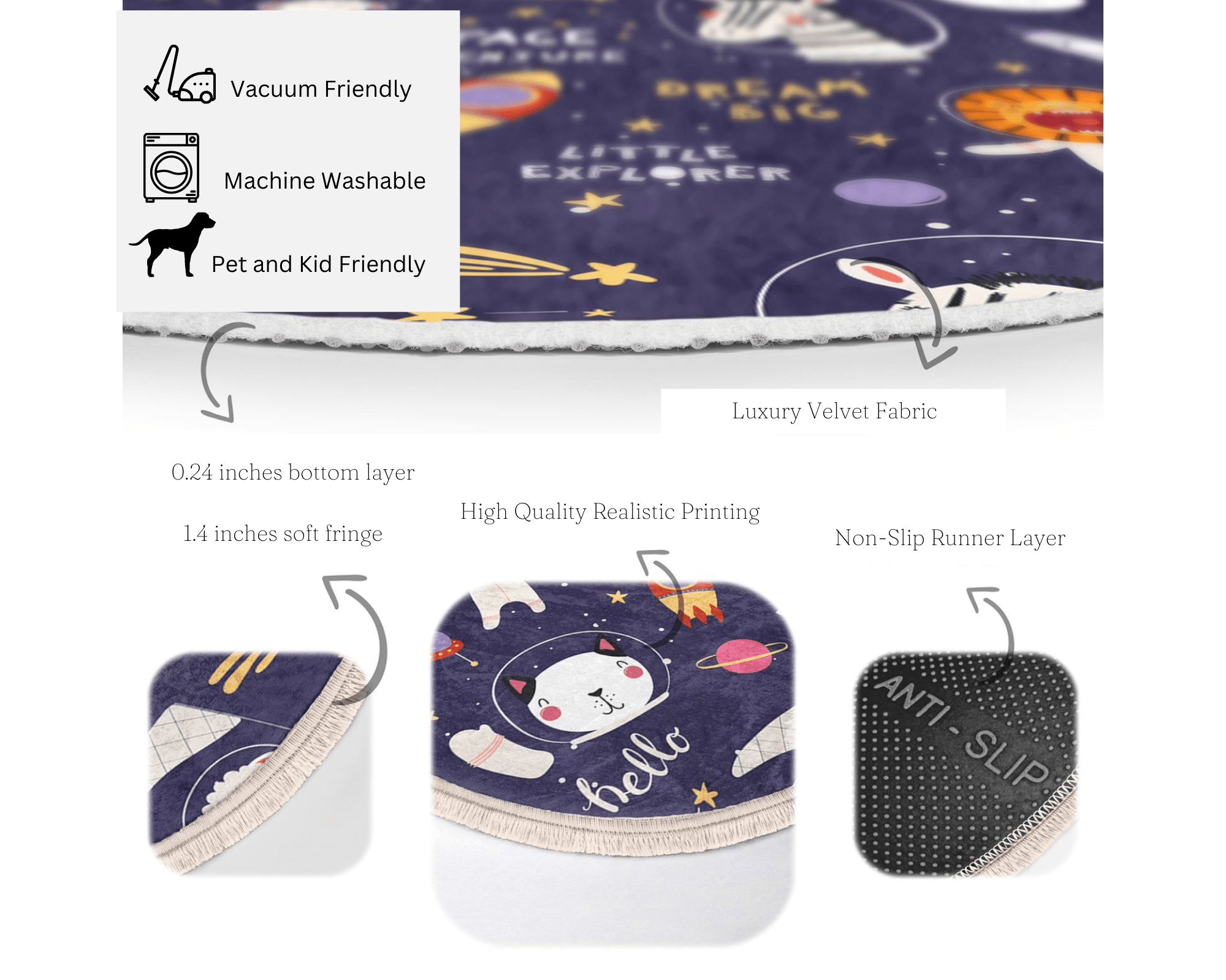 Space Adventure Cute Animal Printed Kids Room Round Rug, Nursery Room Decorative Circle Rug