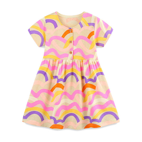Summer Pure Cotton Waves Pattern Short Sleeves Dress for Stylish Girls